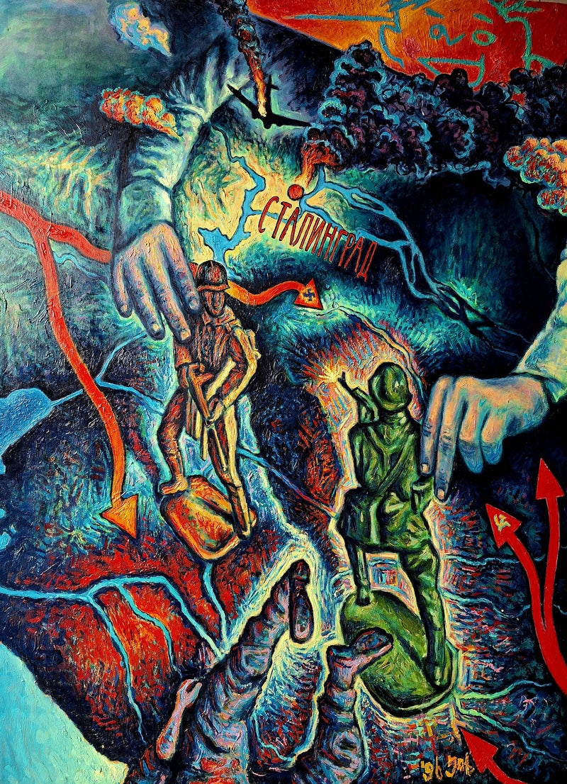VROEGER BEVOCHT IK MIJN OORLOGEN OP HET BLAD VAN DE TAFEL. ( SLAG BIJ STALINGRAD.) Olieverf op doek. 140 bij 105 cm. 1996.
